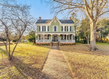 McGowan-Gary House, 311 Greenville Street (1887): Two-story, weatherboarded residence with cross-gable roof. The central bay of the facade has a double door entrance with sidelights and transom on the first story, a tripartite window on the second story, and a gabled peak in the front roof line with semicircular arched, louvered attic vent. Windows have six-over-six lights, shelf architraves, and louvered shutters. There is a boxed cornice with returns and sawn brackets. The single story, hip roof porch on the facade is supported by chamfered posts with a turned balustrade and pierced brackets